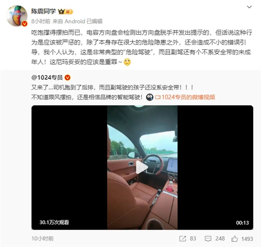针对第二个视频,知名汽车博主陈震提出了自己的见解。在他看来,该视频系摆拍,因为电容方向盘会检测出方向盘脱手并发出提示。