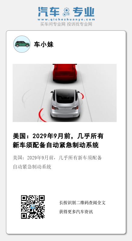2023年,NHTSA曾提议要求几乎所有车辆在该法规公布三年后遵守该法规,但现在给了汽车制造商五年的时间。根据NHTSA的要求,所有乘用车和卡车的时速在62英里以内都能够停车且避免撞上前车;当与前车即将发生碰撞,汽车时速在90英里/小时以内时,制动系统需要自动刹车;当检测到行人时,系统可在时速45英里以内启动。