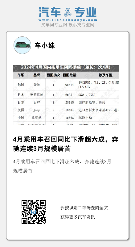 聚焦具体品牌召回情况,奔驰以92544辆的召回规模领跑,占召回总量的42.72%。1-4月,奔驰每月都发布了召回公告,共计召回乘用车达735072辆;且2-4月,奔驰都是召回数量最多的品牌。