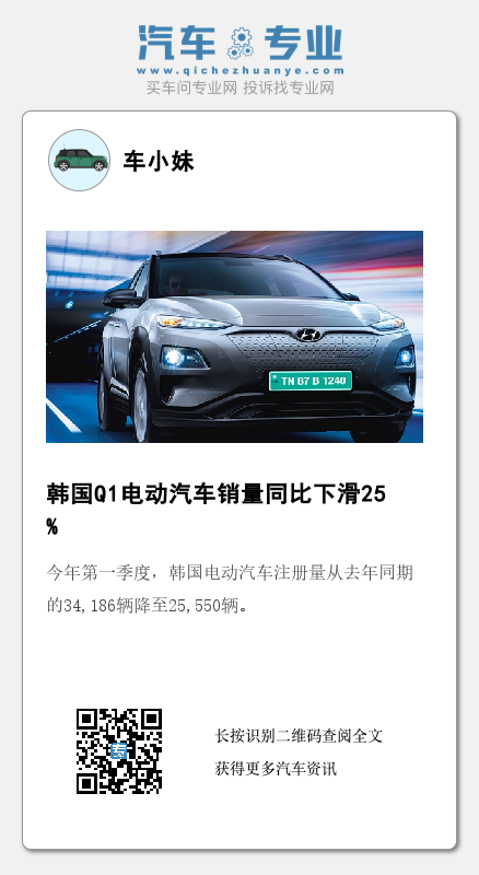 CarIsYou在一份声明中表示,由于全球电动汽车销量增长放缓,今年第一季度,该国电动汽车注册量从去年同期的34,186辆降至25,550辆。该机构在声明中称,这是韩国第一季度电动汽车销量首次出现同比下降。相比之下,混合动力汽车的销量从去年同期的68,249辆大幅提升到了99,832辆。