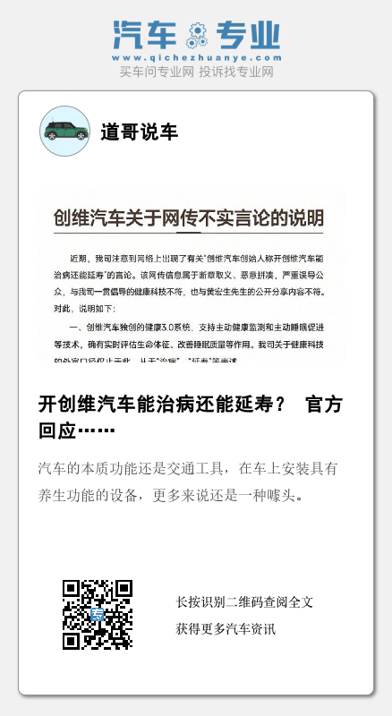 一时间,“创维汽车可以治病和延寿”的说法遭到热议,甚至有网友直言“像在看保健品广告”“这难道不算虚假宣传?”“这些言论怎么听都像是传销。”等。