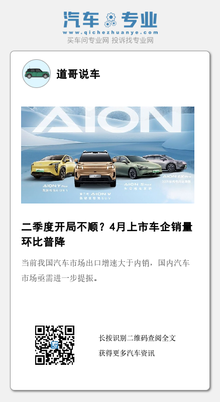 据中国汽车协会数据,今年4月汽车产销分别完成240.6万辆和235.9万辆,环比分别下降10.5%和12.5%,同比分别增长12.8%和9.3%。结合整个市场的销量变化来看,上市车企多环比下滑也符合市场趋势。乘联会秘书长崔东树发文指出“虽然4月有22个工作日,同比多两日,但因价格不稳等因素导致消费者观望气氛浓重,4月乘用车零售出现周期性环比下行走势”。
