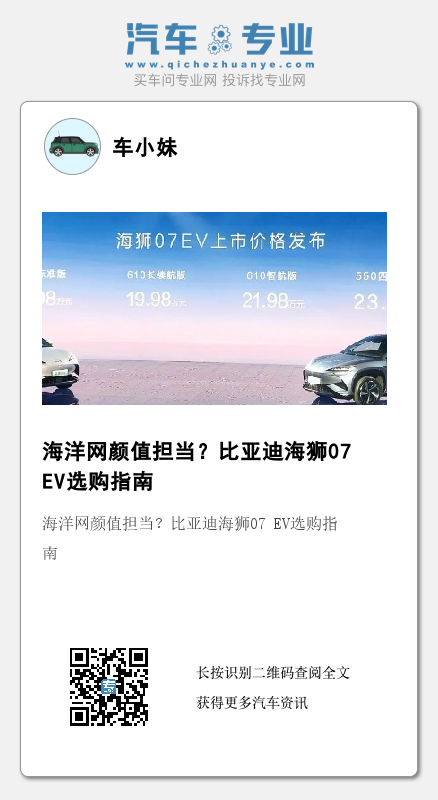 比亚迪海洋网终于有一款颜值高的纯电SUV了!日前,基于全新的e平台3.0 Evo的海狮07 EV(图片|配置|询价)正式上市,定位纯电中型SUV,共推出四种版本,售价为18.98-23.98万元。