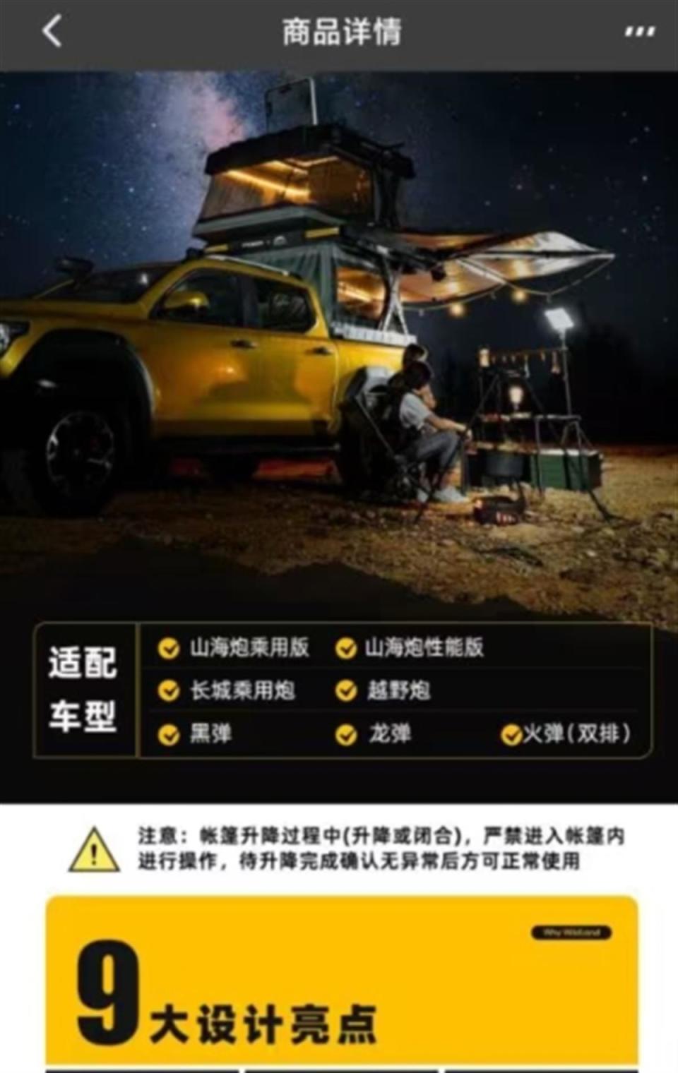 长城炮APP介绍,“山海居”为上下两层电动车顶帐篷,由遥控控制升降。售价为23999元,APP上显示为售罄。