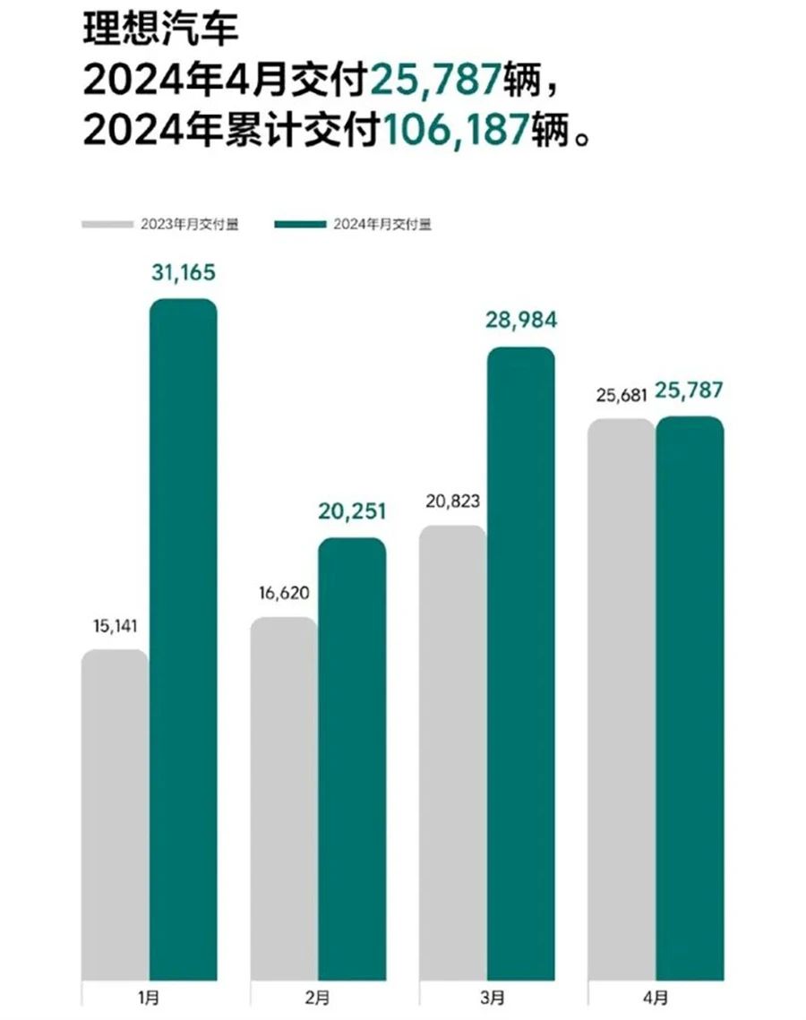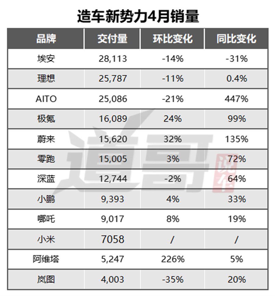 一季度销量榜首的问界,终于在4月放缓了步伐,交付量2.5万台,位居新势力销量第三。与此同时,埃安凭借2.8万的交付量成功卫冕。理想则是以微弱优势重回老二宝座,交付新车2.58万辆。