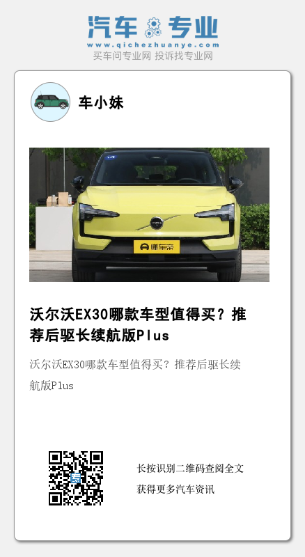 沃尔沃EX30有着出色的外形设计以及齐全的安全配置,新车上市之后将会和smart精灵#1等车型进行竞争。在推出的4款车型中,小编认为21.98万后驱长续航版Plus版本性价比最高,该版本拥有590公里纯电续航,基本属于主流水平,同时舒适性配置以及安全性配置搭配也比较的均衡,售价也比较有竞争力。