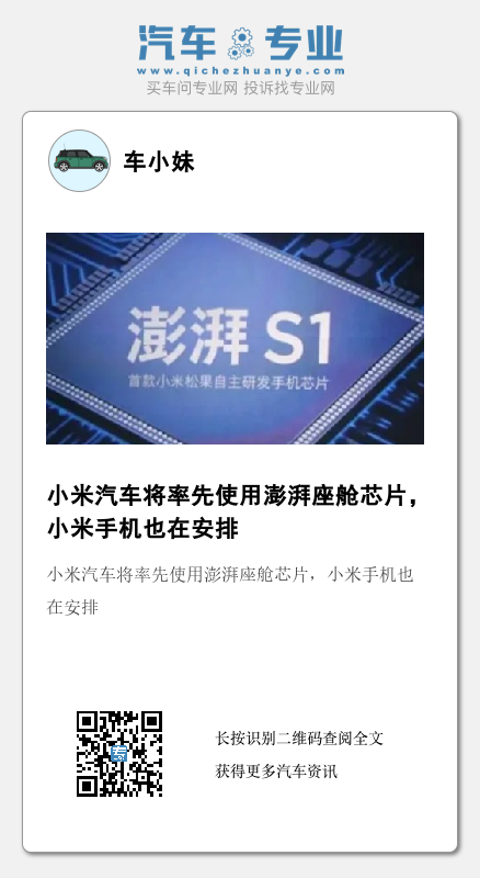 今年3月底,小米首款汽车SU7正式发布,提供小米SU7、小米SU7 Pro和小米SU7 Max三款车型,起售价格为21.59万元。根据官方公布的信息,小米SU7车机搭载了骁龙8295旗舰座舱芯片,配备16GB运行内存和256GB存储空间,中控大屏幕拥有60Hz的刷新率,预装小米HyperOS系统,软硬件协同。如今来看,未来的小米汽车上,澎湃芯片或将取代骁龙座舱芯片。