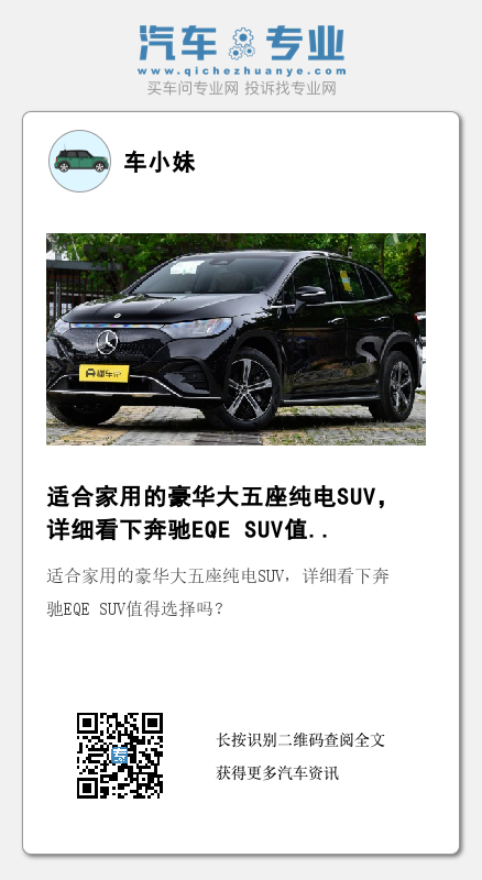 虽然我们体验的2024款 EQE SUV 500 4MATIC 先锋版是车系中的入门版,但这款车有着和顶配车型相同的动力和续航表现,配置方面也比较丰富,再加上宽敞实用的空间,是一款值得选择的豪华大五座纯电SUV。当然,对这款车感兴趣的朋友可以去线下试驾体验下,根据自己的体验来做出选择。