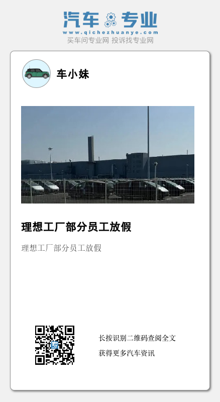 电动知家消息,据凤凰网科技报道,近日,媒体实地探访了位于北京市顺义区的理想汽车北京工厂了解到,工厂的部分员工已经从本周二开始休假,预计下周一上班。一位知情人士表示,在理想北京工厂刚开始投产时,每周只在周六、周日放假 2 天。从大约一个月前起,部分员工的假期增长至 3 天,周五也不用上班。从本周起,部分员工的假期进一步增长至 6 天,只需要在周一上班。