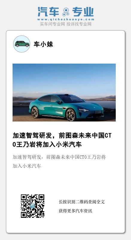 盖世汽车获悉,前图森未来中国CTO王乃岩将加入小米汽车,向小米技术委员会主席、小米汽车自动驾驶负责人叶航军汇报。