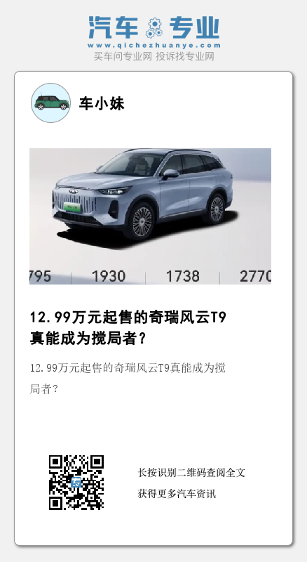 近日,厂商指导价12.99万元起步的奇瑞风云T9(图片|配置|询价),成了众多网友口中要改变市场的搅局者。毕竟价位相当的非纯电动新能源中型SUV,在零跑C10之外,也只有哪吒L能如此突出性价比。