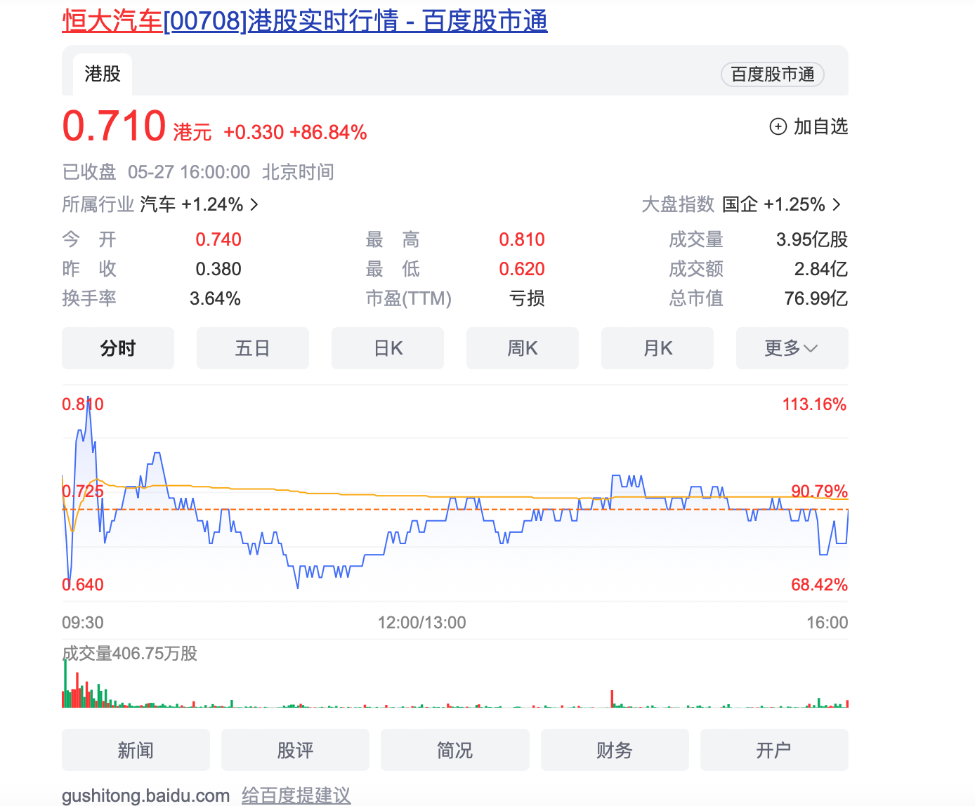 这也意味着,陷入危机许久的恒大汽车,终于要迎来它的“救世主”。或受此消息提振,恒大汽车5月27日复盘后,股价一度涨超100%,截至当日收盘,恒大汽车报收0.710港元/股,涨超过86%。