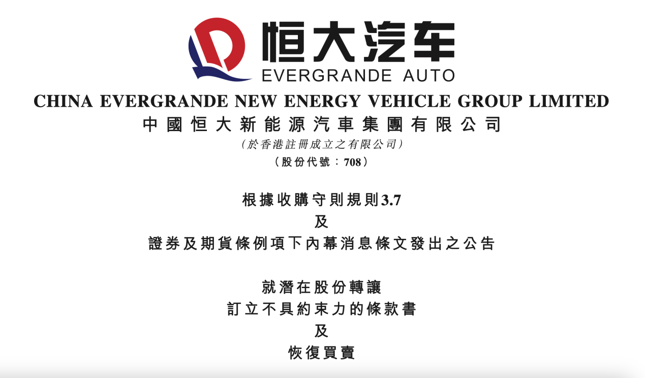 根据恒大汽车公告,有潜在买方与公司股东中国恒大集团(清盘中)、恒大健康产业集团有限公司、Acelin Global Limited(统称“潜在卖方”)订立条款书,将受让上述股东所持恒大汽车相关股份(上述数额)。尽管暂时还不知道恒大汽车口中的“潜在买方”是何人,但对于资金严重短缺且已经停产的恒大汽车而言,这至少意味着希望。
