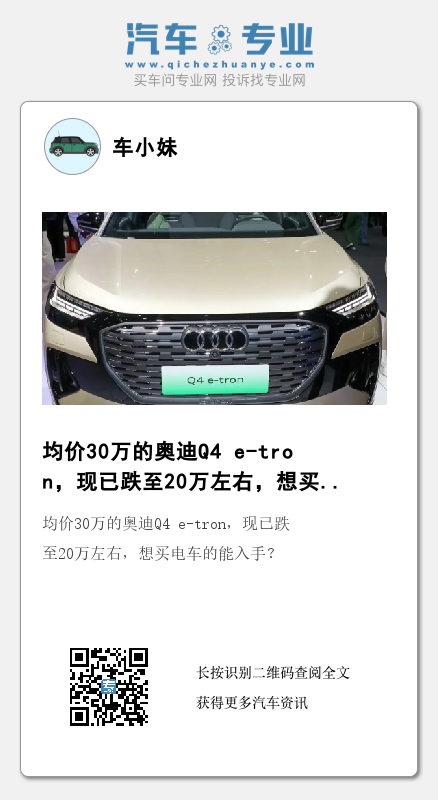 虽然豪华品牌的电车相较于国产造车新势力旗下的车型关注度没有那么高,但眼下BBA品牌旗下的电车其实优惠幅度真心也挺大的。就拿一汽-大众奥迪旗下的Q4 e-tron这款车型来说,原本平均售价在30万以上的它,现在居然已经跌至了20万左右的价格区间,那这样一来,是否也就意味着咱们想买豪华电动车的朋友能够去入手了呢?