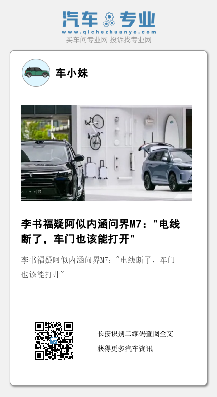 李书福这段话,疑似是在内涵问界M7,4月26日,一辆问界M7在高速路段与高速浇水车追尾,致使车内三人遇难,其中包括一个刚满2周岁的孩子。网友发视频称,“4月26日下午3点左右,我弟弟驾驶着华为问界M7(三个月的新车)在夏县段高速行驶中与高速浇水车追尾,我的丈夫、弟弟和我刚满2周岁的儿子不幸遇难,追尾后车内发生爆炸……”