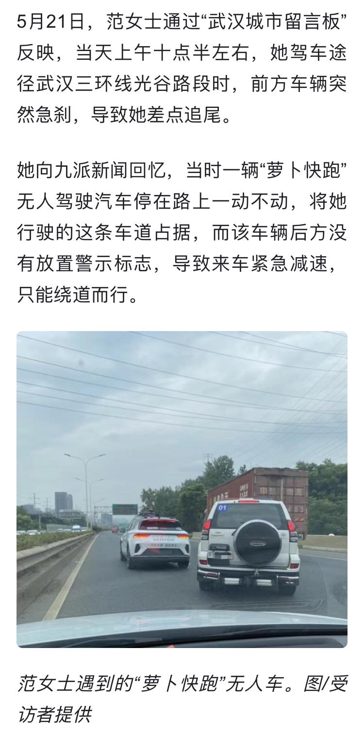 还有多家媒体联系到了武汉市民。据湖北当地媒体九派新闻报道,武汉市一市民范女士正常驾驶时,却遭遇前方车辆突然急刹,导致差点追尾。范女士称,当时一辆萝卜快跑的无人驾驶汽车在路边停着,占据车道并且没有放置警示标志,导致来车紧急减速。