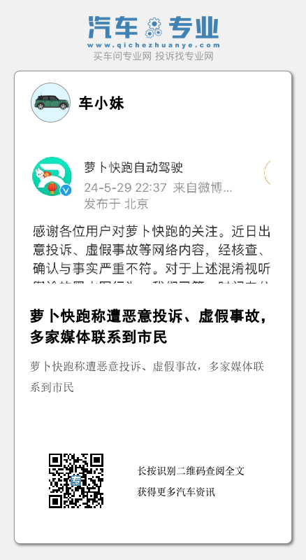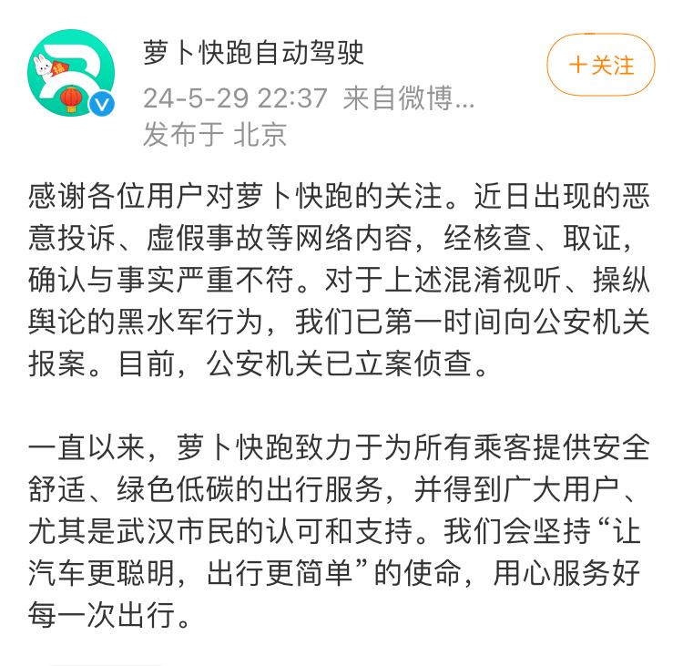 5月30日消息,昨日晚,萝卜快跑自动驾驶官方微博发声明称,针对近日出现的恶意投诉、虚假事故等网络内容,经核查、取证,确认与事实严重不符。