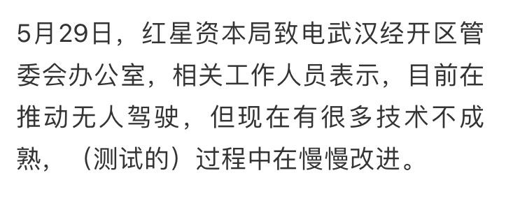 5月29日,红星新闻联系到武汉经开区管委会办公室相关工作人员,对方表示,目前在推动无人驾驶,但现在有很多技术不成熟,(测试的)过程中在慢慢改进。