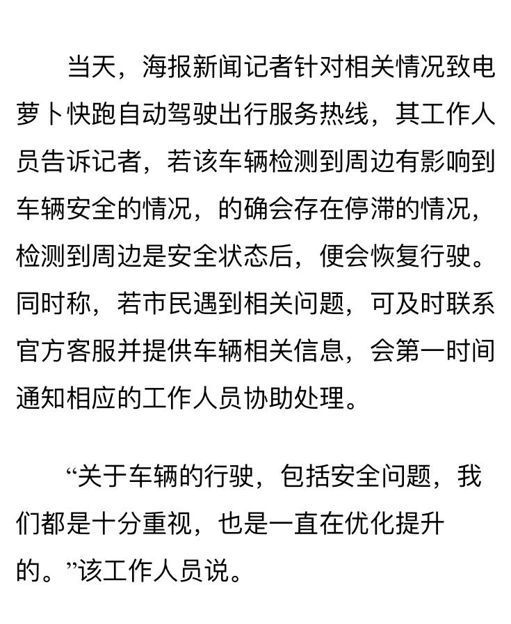 据海报新闻报道,萝卜快跑自动驾驶出行服务热线工作人员表示,若该车辆检测到周边有影响到车辆安全的情况,的确会存在停滞的情况,检测到周边是安全状态后,便会恢复行驶。同时称,若市民遇到相关问题,可及时联系官方客服并提供车辆相关信息,会第一时间通知相应的工作人员协助处理。