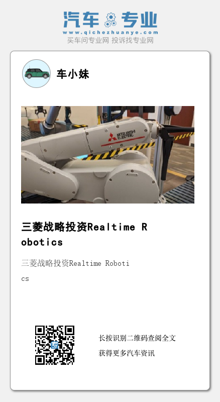 据外媒报道,工业机器人无碰撞自主运动规划公司Realtime Robotics宣布获得三菱电机的战略投资。这是Realtime Robotics最近启动的B轮融资的领投方。三菱电机也是其A轮融资的参与者,并将在Realtime董事会增加一名高级代表。