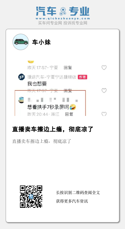 消费者买的是车,看重的是汽车本身产品力,那些妄想通过靠着歪门邪道直播博取眼球的商家,不仅贬低了自家店,也拉低整个汽车行业的形象。