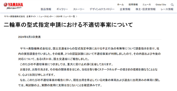 此外,除了雅马哈以外,日本国土交通省通报的测试造假企业中,还有马自达,丰田,本田,铃木等企业。