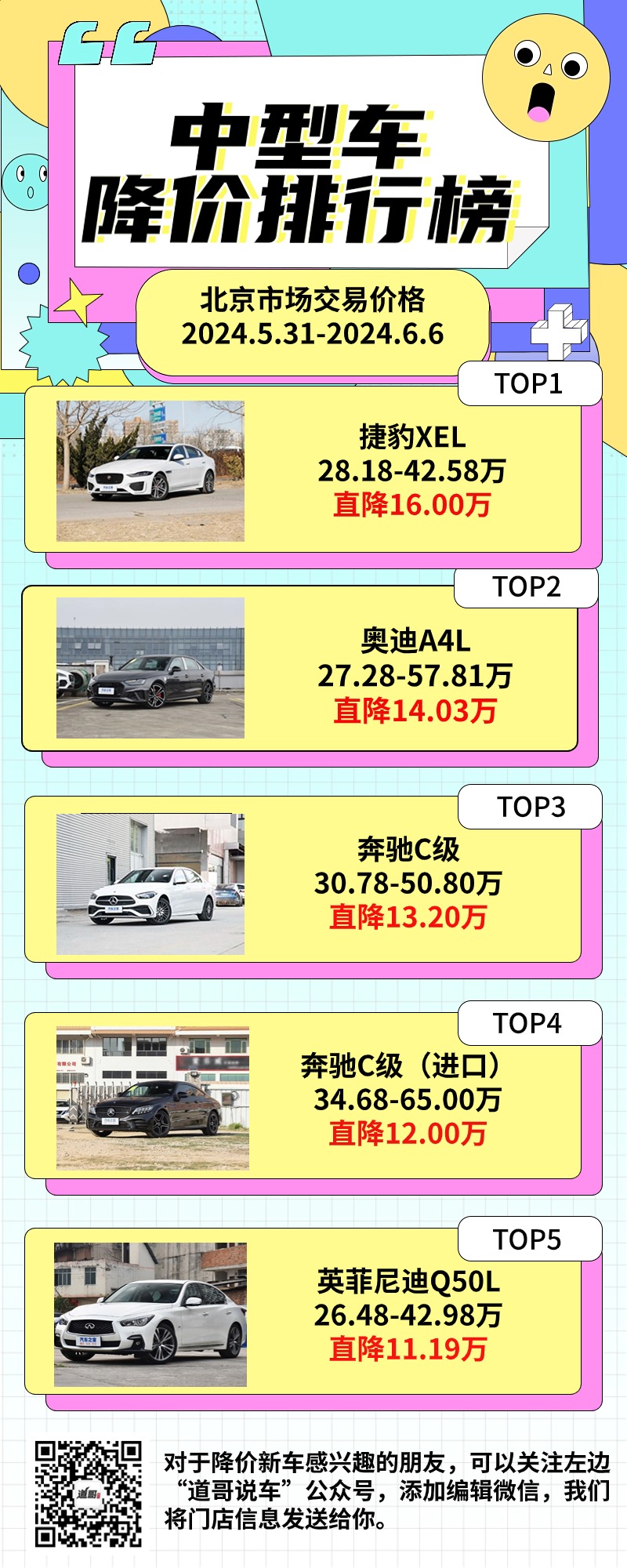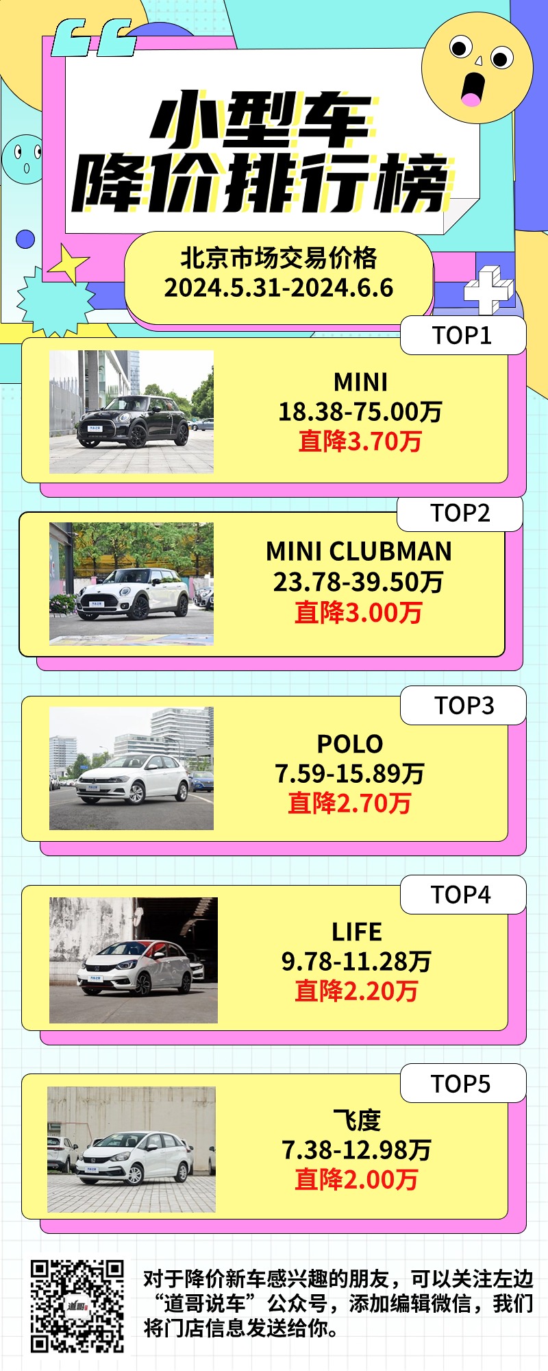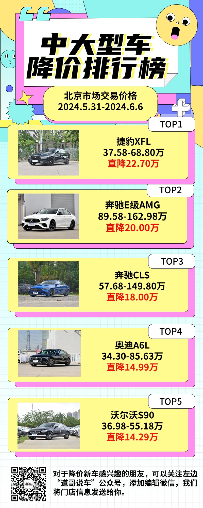 【文/财圈社&道哥说车 张浅】马上就要到端午节了,本周又有哪些优惠新车值得一看呢?小型车方面,榜单前五车型和降幅均与上周保持一致,其中,MINI车降幅最高,达到3.7万元;中型车方面,捷豹XEL以直降16万元的优惠力度位列榜单第一位,且较前两周优惠力度加大,奔驰C级的降幅较前两周则多优惠0.1万元;中大型车方面,捷豹XFL较前两周优惠力度加大,直降22.7万元,奔驰CLS较前两周又多优惠了1.74万元,奥迪A6L进入榜单第四位,直降14.99万元,而进入榜单第五位的沃尔沃S90直降14.29万元也同样值得关注。