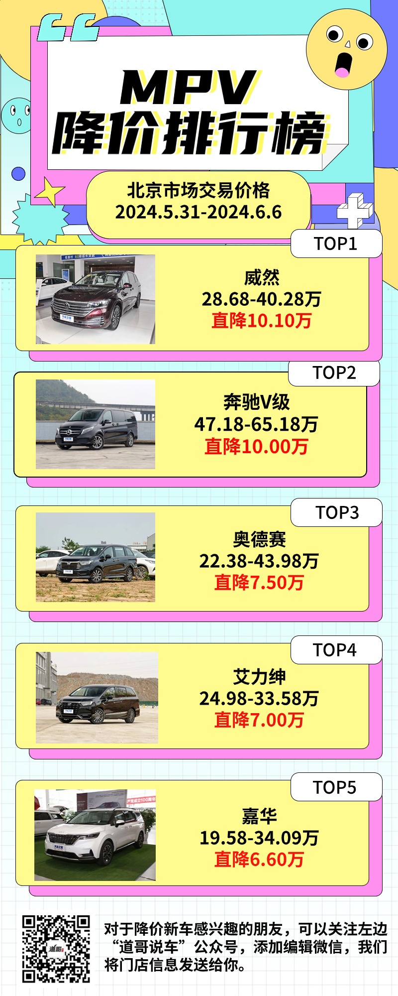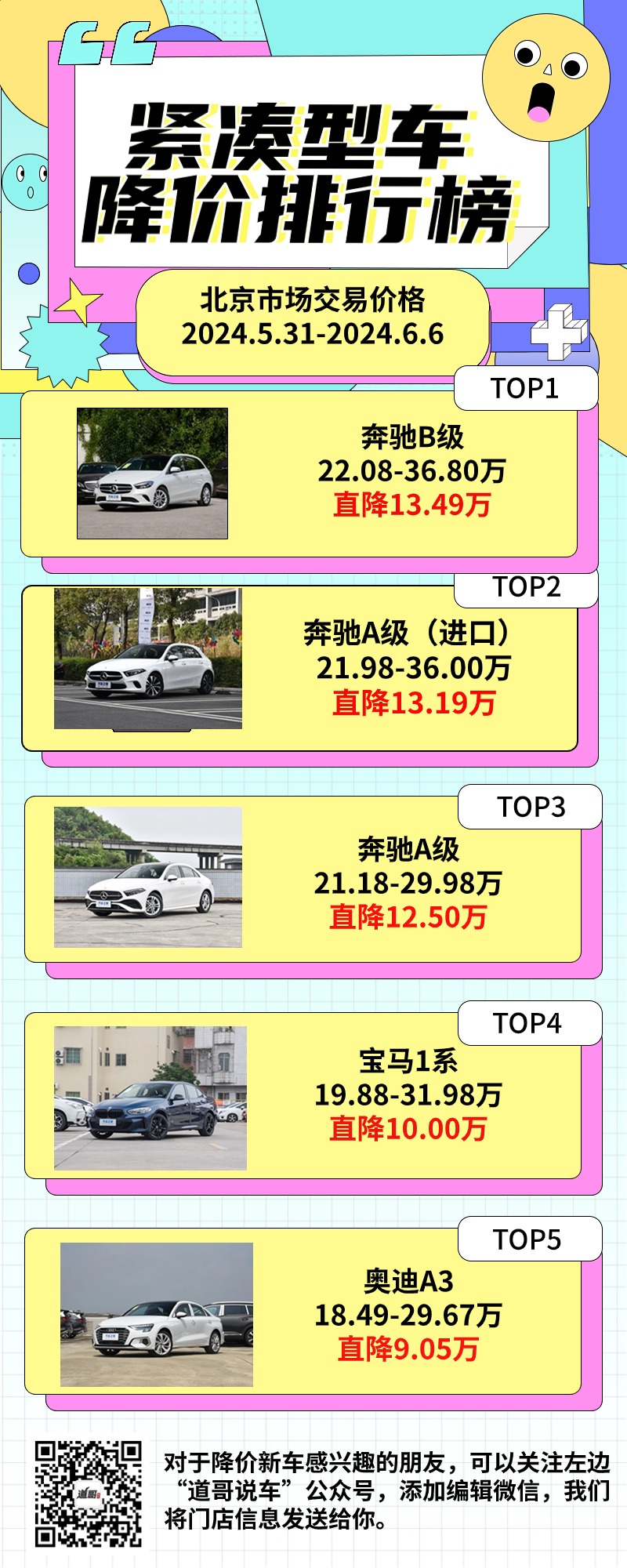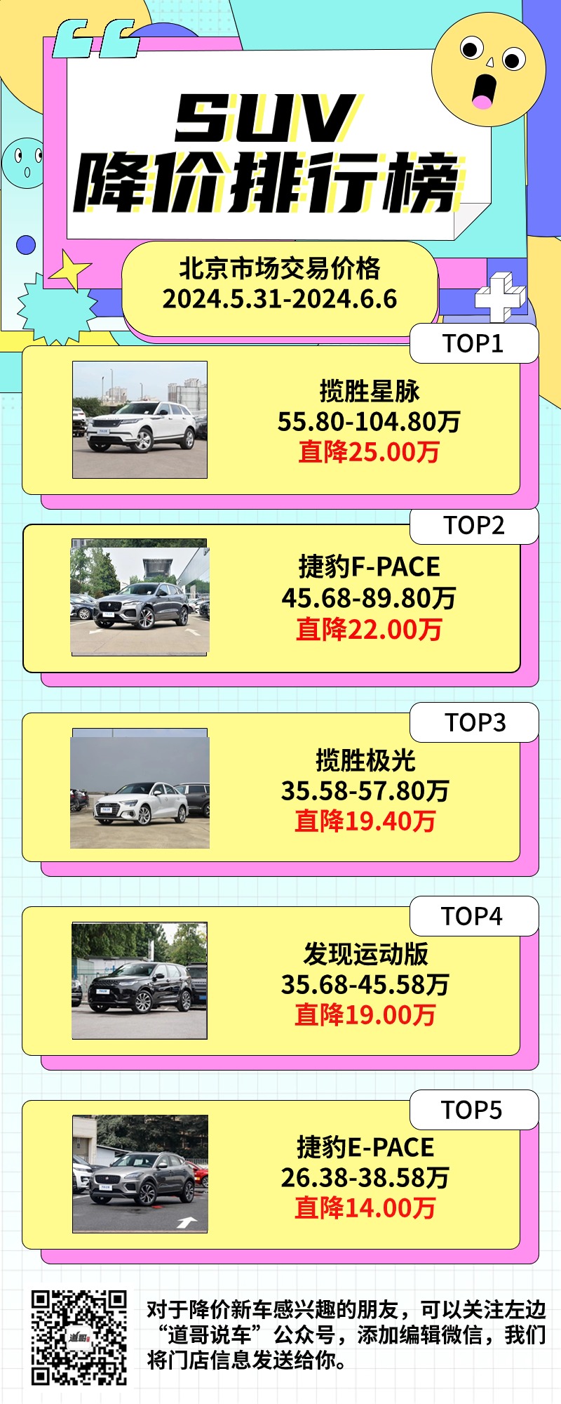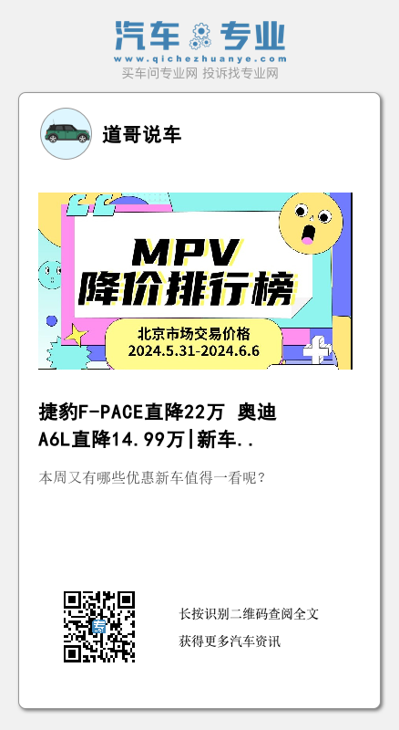 关注度较多的紧凑型车方面,奔驰B级较前两周多优惠了2.48万元,奔驰A级多优惠了2.5万元,同时,奔驰A级(进口)进入榜单中,直降13.19万元;备受关注的SUV车型方面,揽胜星脉以直降25万元的优惠力度位列榜单第一位,且降幅较前两周多出2.99万元,紧随其后的捷豹F-PACE直降22万元位列第二,揽胜极光和发现运动版的优惠力度均较前两周加大,捷豹E-PACE也以直降14万元的力度能进入榜单第五位;近年来关注度越来越高的MPV车型方面,榜单前五车型和降幅均与前两周保持一致。