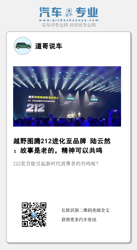 也正是因为这一点,212的情怀价值被无限放大,甚至放眼当前自主越野车型,谈情怀,没有比得上212的产品。陆云然表示,“212所带来的情怀不是虚的,传承是有的,过去的故事是有号召力的,212承担着历史角色,它的号召力是很大的”,而那部分对212有记忆点的人群将成为212的主流消费群体。