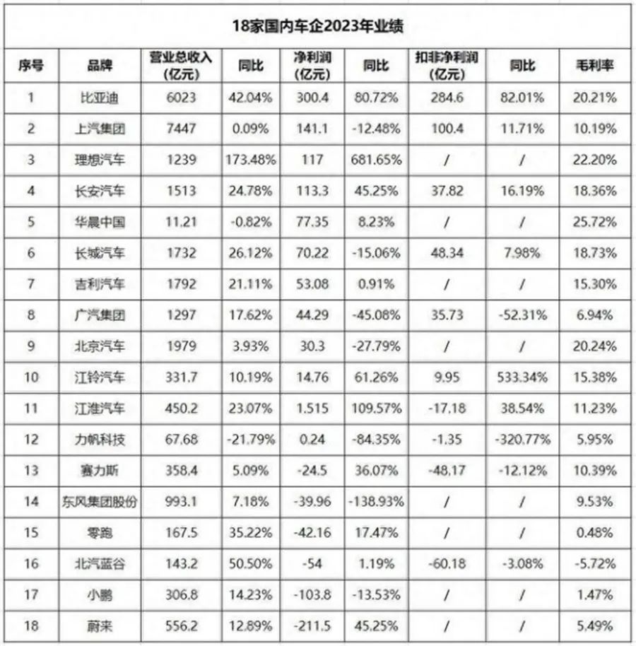 编辑注意到,曾庆洪所说的盈利问题确实是不少中国车企的痛点。从目前可统计到的18家上市车企2023年业绩来看,有12家在2023年是盈利的,还有6家仍然是亏损状态,合计盈利不到500亿元。而如果单看12家盈利的车企,合计盈利也仅为963亿元,不足千亿。再来看看国外车企,2023财年,丰田净利润预期上调至4.5万亿日元,折合人民币2100亿元,这意味着,中国18家车企的利润总和连丰田的一半都不到。