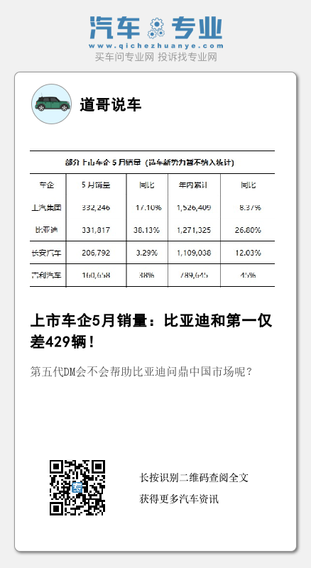 本次统计中,比亚迪5月及前5个月销量均实现同比增长,但比这更令人震惊的是,比亚迪的销量排位,其5月销量高达331,817辆,与排名第一的上汽集团仅仅相差429辆。自新能源汽车崛起以来,比亚迪一直在“坐二望一”,而今年5月的数据,可能是比亚迪最接近国内汽车市场“老大”位置的,或许比亚迪离问鼎不远了。