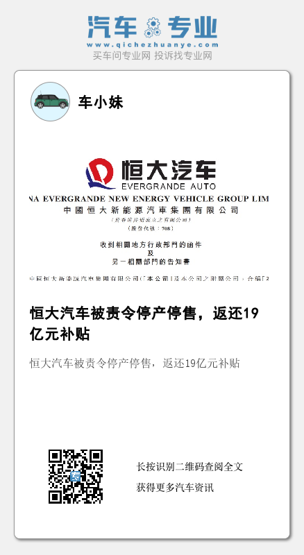 与此同时,恒大汽车的公告还称,相关附属公司日前收到相关地方行政部门下发函件及另一部门告知书,要求退回19亿元补贴。