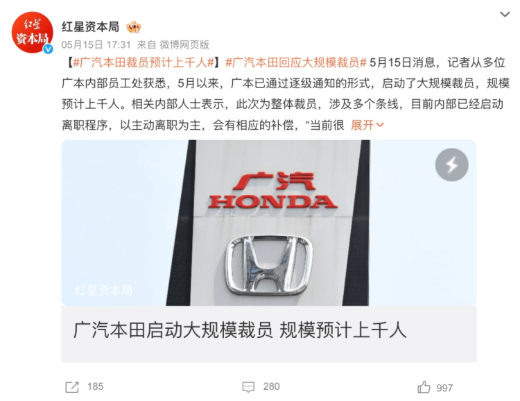销量下滑加上裁员,足以把广汽集团推向风口浪尖。