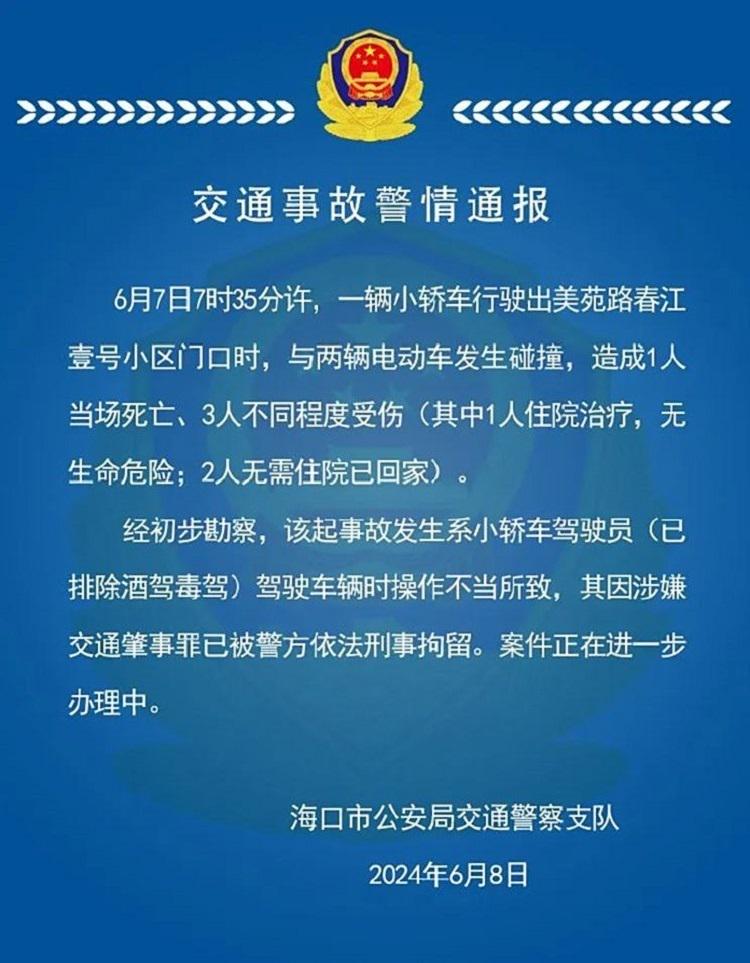 据海口市公安局交通警察支队发布通报称,一辆小轿车在驶出小区门口时,与两辆正常行驶的电动自行车发生碰撞,造成1人当场死亡、3人不同程度受伤的严重后果。