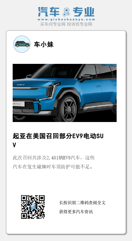 此次召回共涉及2,401辆EV9汽车,这些汽车在发生碰撞时车顶防护可能不足。起亚于5月底开始生产EV9,并在试生产测试中发现了这一问题。