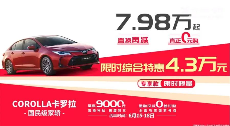 卡罗拉锐放和卡罗拉分别给出3万元至4.3万元不等的综合优惠,起售价分别为9.98万元和7.98万元。这个数字是不是有点熟悉?有趣的是,无论是微博文案还是视频内容,一汽丰田都使用了“超BeYonD”的表达,其中B、Y、D三个字母大写。