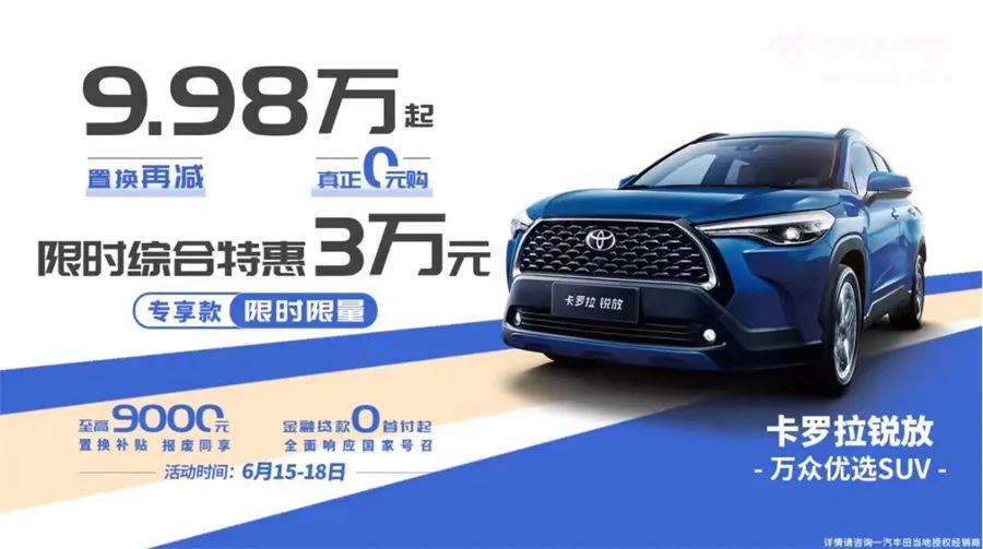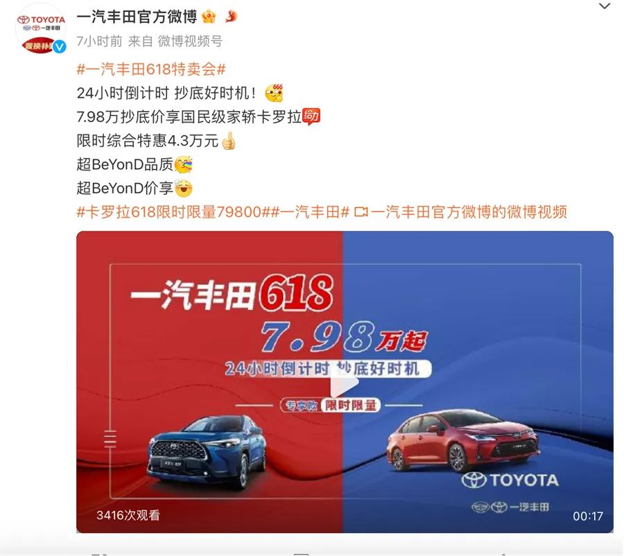 【文/财圈社&道哥说车 麻建宇】“618”一个诞生于电商平台的“狂欢节”,在现在以及不久的将来,或许也会成为汽车品牌的“狂欢节”。6月18日当天,一汽丰田官方微博发文举行“一汽丰田618特卖会”,参与特卖会的车型也给出了一个低价。