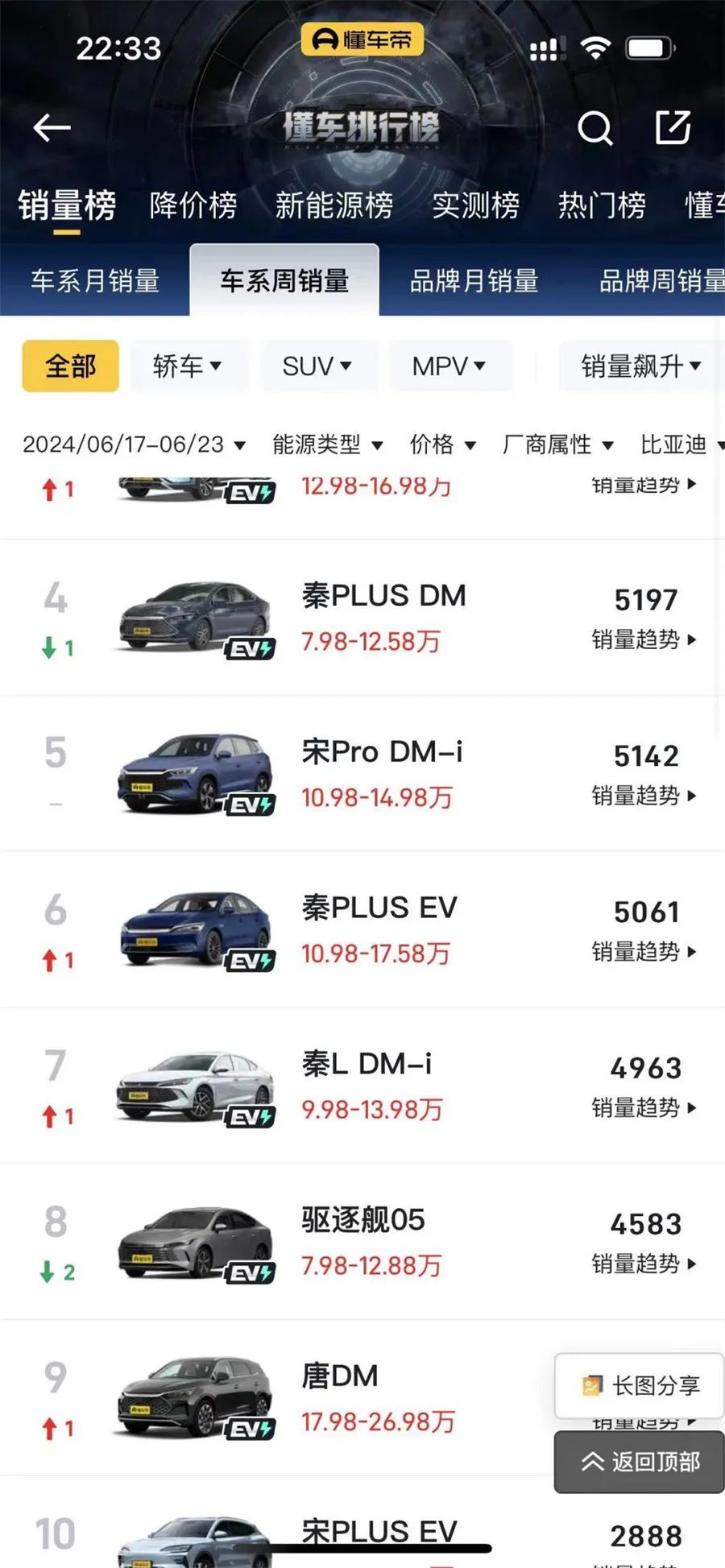 作为比亚迪第五代DM的开山之作,秦L的销量表现非常值得关注,毕竟这可能代表着比亚迪第五代DM是否仍具有统治力。而事实证明,“工业奇迹”确实也不是白叫的,根据懂车帝最新周销量排行榜(6/17-6/23),秦L的最新周销量为4963辆。