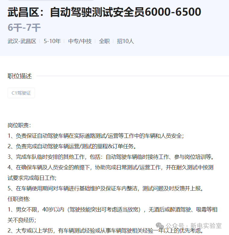 查找招聘信息能看到,武汉市多区都发布过“自动驾驶测试安全员”的招工需求。岗位职责主要是,负责保证自动驾驶车辆在实际道路测试/运营等工作中的车辆和人员安全等工作,任职资格与传统司机的要求差不多,薪资平均在6000-6500元,也与网约车司机实际收入相当。