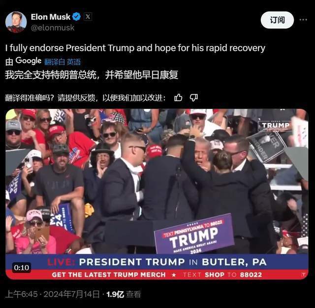这成为了全球爆炸新闻,而在海外最大的社交平台上,六年前因为贸易战关税问题,近乎与特朗普决裂的 X 拥有者马斯克,发帖公开表示「我完全支持他,希望他早日康复」——这帖子有 1.9 亿阅读量。