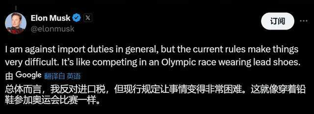 2018 年特朗普掀起的贸易战,让马斯克在推特上痛斥:「我反对进口税...这就像是奥运会上,穿着铅做的鞋子赛跑」。