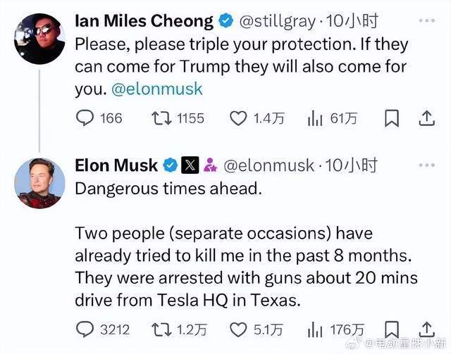 而特朗普遇袭之后,马斯克也表示他曾在得州工厂附近,遭遇过两次类似的暗杀危机,「他们在距离得州总部 20 分钟车程的地方被捕,身上有枪」。