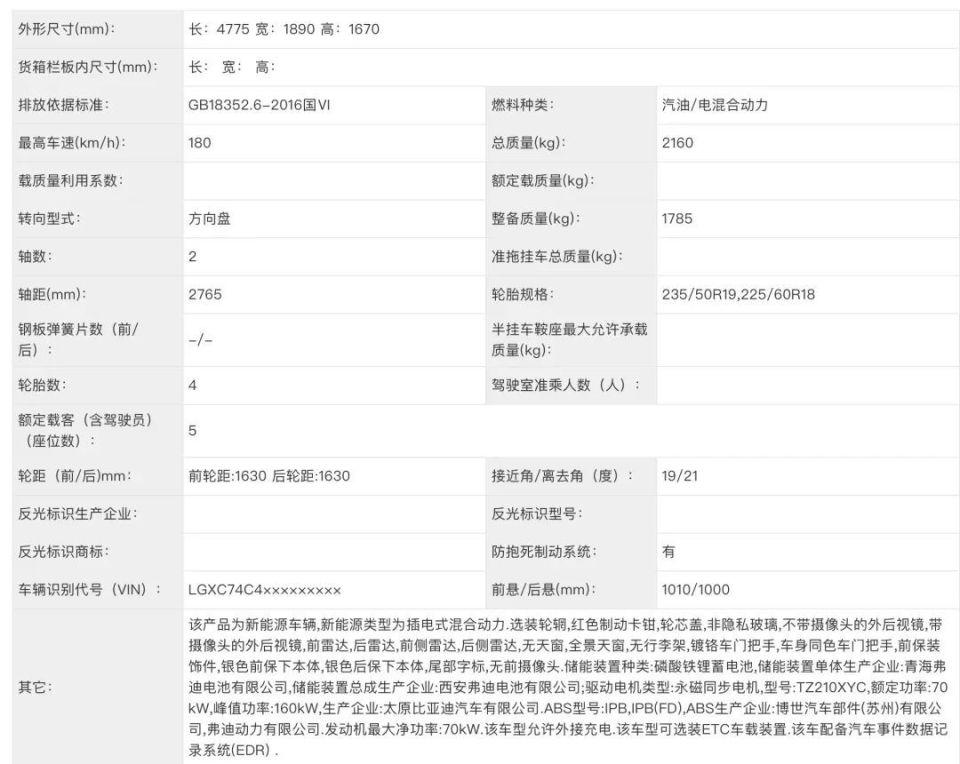 动力和续航,新车配备2.0T发动机+前后双电机组成的插混系统,发动机最大功率200kW,前后电机功率分别为200kW/300kW,性能强悍。电池组容量为36.864kWh,纯电续航里程100km,亏电油耗8.87L/100km,“可油可电”有效兼顾越野和城市用车。