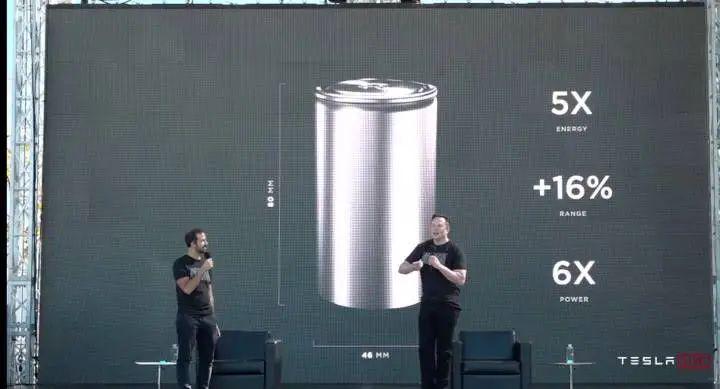 当时的马斯克将这一目标寄希望于一款高 80mm,直径为 46mm 的电芯。「电芯容量可提升五倍,最高可以达到 200Wh/kg,能为车辆增加 16%的续航里程。」马斯克介绍道。