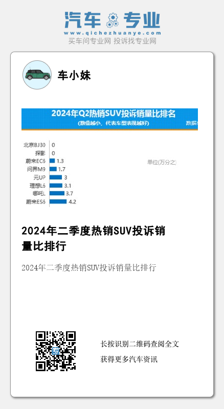 据国内领先的缺陷汽车产品信息收集平台车质网数据显示,2024年二季度共受理国内SUV投诉量累计为13,694宗,乘联会数据显示同期国内SUV(除进口车)销量约为243.3万辆,涵盖330款车型。为确保数据的准确性,车质网本次只统计这330款车型的首次投诉案例,计算得出2024年二季度SUV投诉销量比均值为万分之33,较一季度万分之57.4的均值有明显降低,整体投诉销量比表现呈现出转好迹象。