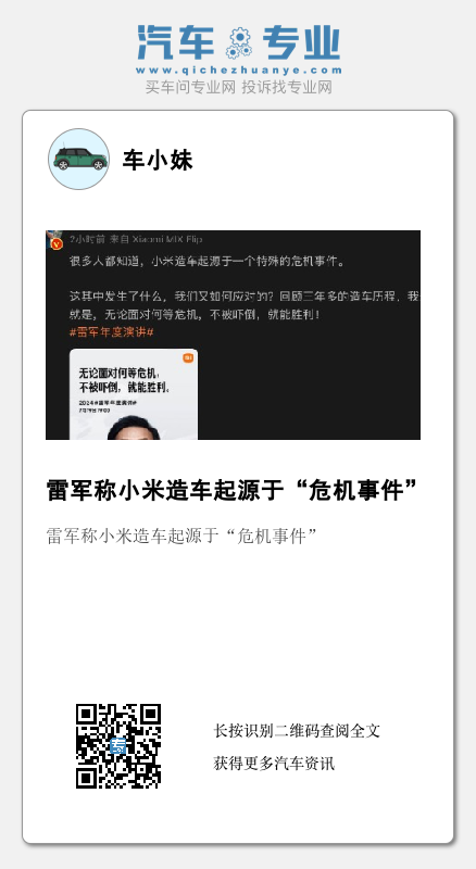 雷军称,很多人都知道,小米造车起源于一个特殊的危机事件。但其中发生了什么?小米又如何应对的?“回顾三年多的造车历程,我最大的感悟就是,无论面对何等危机,不被吓倒,就能胜利。”雷军表示。