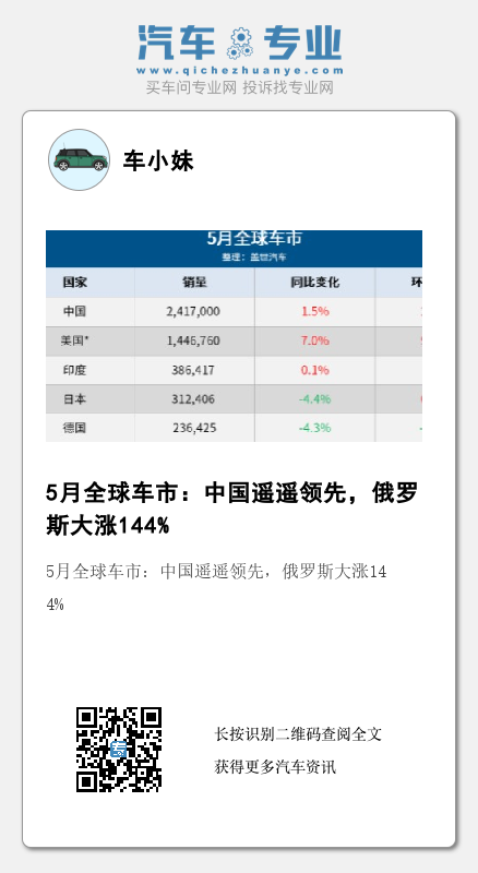 但是,在中国和美国汽车市场的映衬下,欧洲汽车市场表现略为疲软,5月新车注册量同比下降2.6%至109万辆。在欧洲五大主流车市中,意大利(-6.6%)、德国(-4.3%)和法国(-2.9%)的销量均较去年同期有所下滑,但西班牙(+3.4%)和英国(+1.7%)的销量实现了小幅增长。