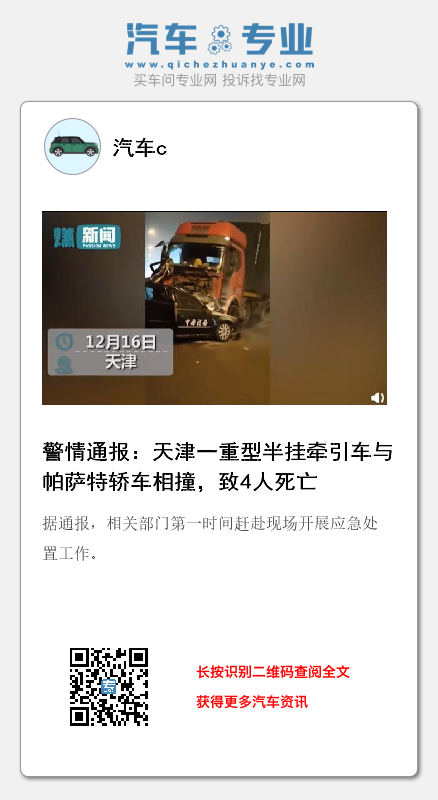 12月17日,天津市滨海新区公安局官方微博今日发布通报称,2019年12月16日20时30分许,在大港海景大道与轻纺大道交口南3.7公里处,一辆重型半挂牵引车与一辆帕萨特轿车相撞,造成帕萨特轿车内4人死亡。