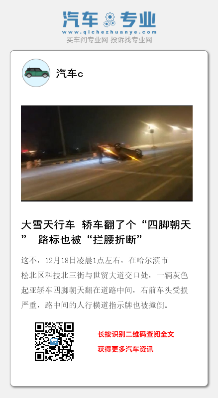 这不,12月18日凌晨1点左右,在哈尔滨市松北区科技北三街与世贸大道交口处,一辆灰色起亚轿车四脚朝天翻在道路中间,右前车头受损严重,路中间的人行横道指示牌也被撞倒。