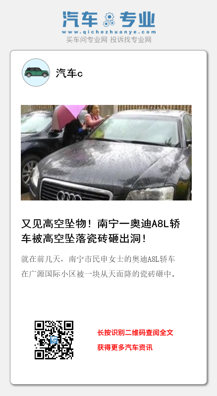 就在前几天,南宁市民申女士的奥迪A8L轿车在广源国际小区被一块从天而降的瓷砖砸中。